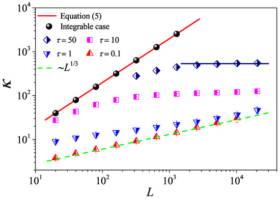 (Color online) The thermal conductivity as a function of the system length L for the 1D fluid system with different values. The symbols are for the numerical results, and for reference, the green dashed line indicates the divergence with L as . For , the horizontal line denotes the saturation value of obtained by Equation (7), where the integration is up a time with measured in Figure 5 bellow.