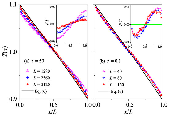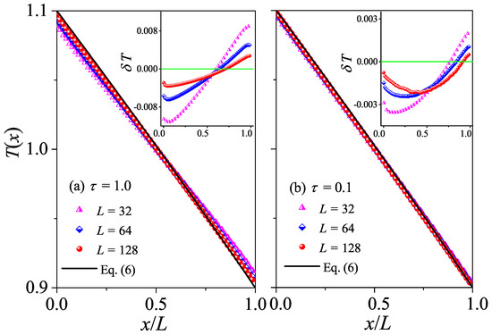 The difference between normal and abnormal heat conduction behaviors can be further appreciated also in the steady-state kinetic temperature profiles . For systems with normal heat conduction, is predicted by Equation (6). In Figure 3a, this prediction is compared with our simulation results for . It is seen that there is good agreement between the results of our numerical simulations and Equation (6). To better appreciate the deviations from the prediction, we also plot the differences between the data and the black line. It is shown in the inset of Figure 3a that decreases with increasing L, as expected since decreases when L increases, indicating that the linear response can correctly describe the transport properties of the system for a long enough system. As introduced in the Section 2, for systems with abnormal heat conduction, the typical feature of the temperature profile is that is concave upwards in part of the system and concave downwards elsewhere, and this is true even for small temperature differences [29,30]. This is confirmed in Figure 3b by our numerical simulations for . Note that the data for three different L overlap with each other, implying that the deviations from Fourier’s behavior are not finite-size effects. Altogether, those numerical results again support our findings based on the length-dependence of the thermal conductivity, that heat conduction in the weak interactions is normal, while in the stronger interactions, it is abnormal.
