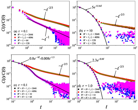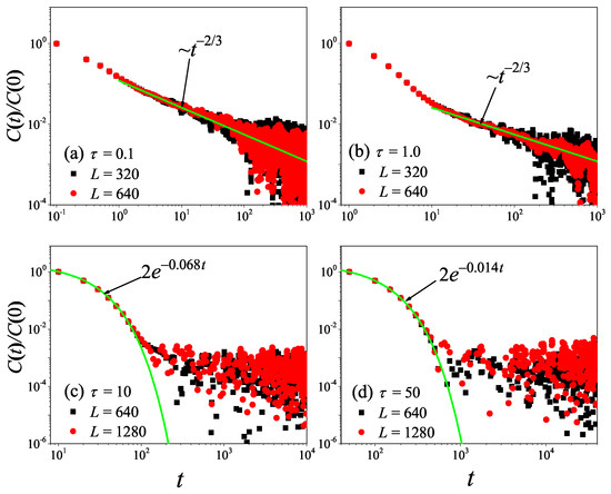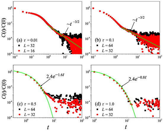 To check what was obtained in the 3D non-equilibrium modeling, we now turn to the comparison with the results obtained by the Green–Kubo formula in the equilibrium modeling. The results for with different values are presented in Figure 12. It can be seen from Figure 12a,b that, for and , the correlation function eventually attains a power-law decay with , fully compatible with the theoretical prediction of the 3D case [47].