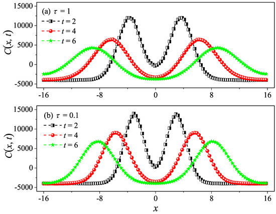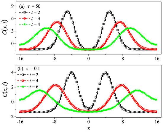 However, it is clear in Figure 4c,d that, for and , undergoes a rapid decay at short times, and eventually, it begins to oscillate around zero (the negative values of are not shown in this log–log scale). The fitting function with the green solid line exhibits an exponential decay. To compare and more accurately, we compute the sound speed of the system with the help of the spatiotemporal correlation function of local heat currents defined in Equation (8). In Figure 5, we present for the system size . The two peaks representing the sound mode can be clearly identified in Figure 5a,b. Their moving speed is measured to be for and for . In Figure 2, the horizontal line for is obtained, truncating the integral in Equation (7) up to with . It can be seen that agrees with . Thus, the equilibrium simulations are fully consistent with the non-equilibrium simulations.