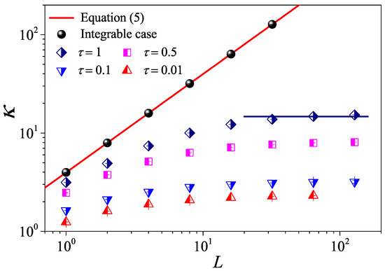 As for the 1D case, let us first report the dependence of on L for different values, as can be seen Figure 6a. To provide a numerical check, we show that the non-interacting (integrable) expression Equation (5) (red solid line) very accurately matches the simulation data (black circles). For the interacting systems, it can be seen in Figure 6a that, for the weak interactions (), tends to saturate and becomes constant as L is increased. This indicates that the normal heat conduction behavior for the nearly integrable 2D fluid system is also dominated by the kinetic effect. However, as decreases, is no longer constant but diverges with L. In particular, for and , eventually approaches the scaling like that predicted in 2D momentum-conserving systems [47]. Therefore, the scenario is similar to the 1D case and can be described as a crossover from kinetic to hydrodynamic regimes.