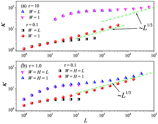 We show that the MPC approach can be successfully used to investigate this issue, considering 2D and 3D mesoscopic fluid models with fixed transverse sizes ( in 2D and in 3D) and study how changes with L. It can be seen from Figure 14a that, in 2D fluid models, upon increasing the aspect ratio of the system, for both and , eventually follows the 1D divergence law as L increases. This means that, both in the cases dominated by the kinetic () or hydrodynamic effect (), there exists a dimensional-crossover above a given aspect ratio. As shown in Figure 14b, in 3D fluid models, there is also a similar phenomenology. Altogether, these results confirm that the theories developed for the strictly 1D case effectively also extend quasi-1D, provided that the transverse extent of the sample is small enough.