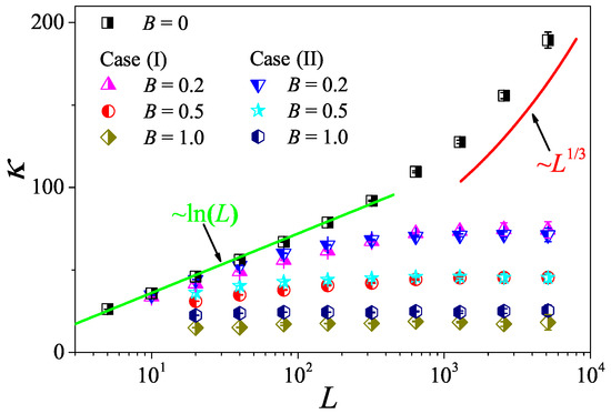 The above two questions have only recently been well answered in our research [54], where it is shown that, under the same pseudomomentum conservation, the 2D fluid system with magnetic field can exhibit normal heat conduction behavior. Specifically, we consider a 2D system of charged particles as depicted in Figure 1b. In this system, a constant magnetic field perpendicular to the plane of motion, , is imposed. The particles interact via the modified MPC dynamics to maintain the pseudomomentum conservation of the system (see [54] for details). To compare with the results obtained in [49], we also consider two cases: case (I) with uniform charges and case (II) with opposite charges on each half of particles, say . In Figure 16, we plot the relation of vs. L for various B obtained by the non-equilibrium thermal-wall method. It is shown that, for , the system with momentum conservation exhibits the crossover from the 2D to 1D behavior of the thermal conductivity under the condition of increasing the aspect ratio of the system. However, for , heat conduction behaviors in both cases with pseudomomentum conservation are normal because, as L increases, approaches a finite value.