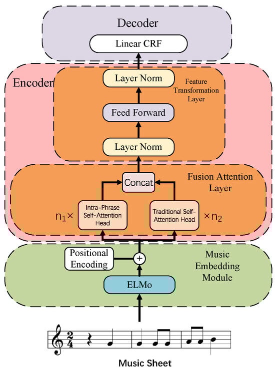 Our model architecture comprises a music embedding module, an encoder, and a decoder, as shown in Figure 1. The music embedding module incorporates an ELMo embedding model and a positional encoder. The encoder consists of a single-layer Transformer encoder without residual connections, integrated with a Fusion Attention Layer. The decoder is implemented using a linear Conditional Random Field (CRF) layer. The details are as follows: