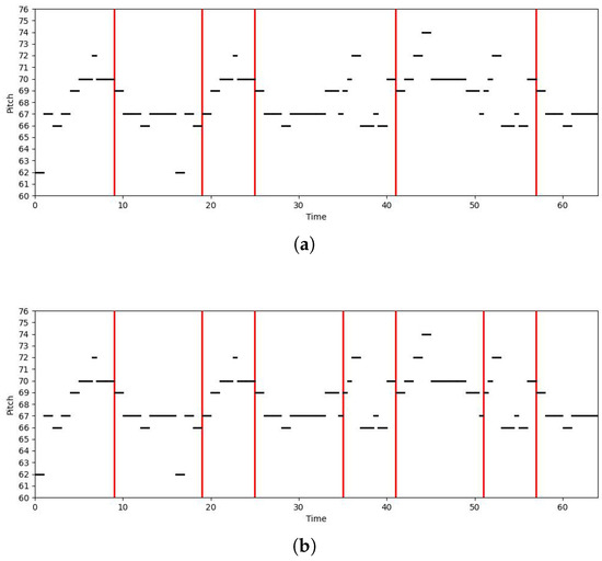 During model training, 90% of the data were used for the training set, with the remaining 10% randomly allocated as the test set. Additionally, the training set underwent data augmentation. Specifically, the pitch of each song was transposed within an octave range (from −12 to +12 semitones) to help the model not only learn the relative relationships within phrases but also remain robust to absolute pitch changes. This process enhanced the model’s understanding of musical contexts.