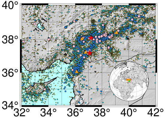 Map showing the epicenters of the study area. The rectangle of the analyzed area has been marked on the globe. The countries of Türkiye (orange) and Syria (green) have also been marked on the map. The yellow circles correspond to earthquakes with a magnitude between 2.0 and 2.9, the cyan circles are those with a magnitude between 3.0 and 3.9, the blue circles are those with a magnitude between 4.0 and 4.9, the pink circles are those with a magnitude between 5.0 and 5.9, the orange triangles are those with a magnitude between 6.0 and 6.9 and, finally, the red stars correspond to the first large earthquake 7.5 (further south) and the second large earthquake 7.4 (further north), which occurred just 9 h after the first.