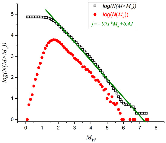 We begin the analysis by presenting the basic properties of the magnitude sequence. Figure 2 considers the Gutenberg–Richter analysis based on the 74,542 earthquakes with an epicenter within the geodesical coordinates defined in Figure 1. The linear fit of the decay of the magnitude abundance corresponds to a straight line described by , where x is the magnitude M of the seism, y is the number of earthquakes with a magnitude larger than M, A is the intercept on the ordinate axis, and b is the slope (a positive number in this formulation), which happens to be 0.91 in this case. The completitude magnitude (determined by the point of maximum curvature) is . After filtering for earthquakes that are equal or over this value, we are left with 55,853 earthquakes for the remaining analysis.