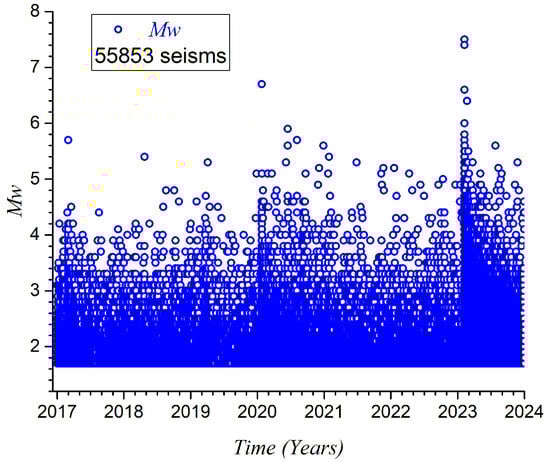 For the present study, we extract data from the catalogs of the Kandilli Observatory and Earthquake Research Institute (KOERI) and the Regional Earthquake and Tsunami Monitoring Center (RETMC) [15]. The RETMC is currently capable of real-time seismic data analysis and the rapid delivery of earthquake parameters and tsunami early warning information to all disaster-related organizations in an efficient and reliable manner. Earthquakes occurring in any part of Türkiye are located, and their magnitude is calculated in near-real time using the data received from this network. Currently, the network comprises a total of 238 stations connected to the RETMC via satellite, GPRS, or internet connection. The data for this paper were selected within the “rectangle” 34 N to 40 N and 32 E to 42 E, from 1 January 2017 to 31 December 2023, initially providing 74,542 earthquakes to be considered. Table 1 lists the characteristics of the main recent earthquakes within the geographical area defined in Figure 1. The largest triggering earthquakes in each sequence were chosen to illustrate this activity.