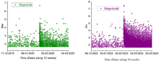 (Left) Magnitude vs. time of foreshocks and aftershocks related to M 6.7 earthquake on 24 January 2020. (Right) Magnitude vs. time of foreshocks and aftershocks related to 7.5 earthquake on 16 July 2023. Time grouped in weeks around main earthquakes.