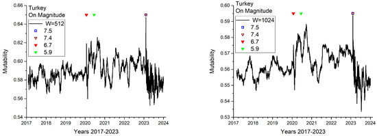 Windows of 256, 512, 1024, and 2048 consecutive events were used to calculate dynamical mutability in magnitudes. The results for and are shown in Figure 5. Special symbols in the upper part mark the positions of the earthquakes, as presented in Table 1. Some features are readily shown in this figure. Rather low mutability values with small oscillations are present until the end of 2020. The oscillations become larger and the values of mutability increase during the same year, following two large earthquakes. Then, the oscillations decrease throughout 2021, but the values remain somewhat larger than at the beginning of the 7-year period. A sharp upward “needle” marks the almost simultaneous 7.5 and 7.4 earthquakes. From then on, the mutability values decrease and strongly oscillate because of the aftershock regime that has not yet finished up to the point of collecting these data.
