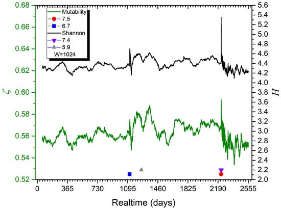 Mutability and Shannon entropy on magnitudes for successive overlapping time windows, each consisting of 1024 events. Symbols mark the earthquakes listed in Table 1.