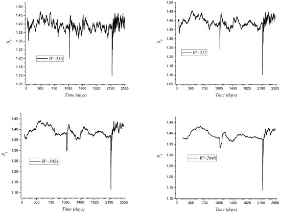 Now, we present an analysis using Tsallis entropy on the magnitudes of the seismic events. This time, we present results using the four time windows with 256, 512, 1024, and 2048 consecutive events. These results are presented in Figure 7. As we found previously in the analysis of mutability and Shannon entropy, Tsallis entropy shows important variations due to the presence of the great earthquakes highlighted in Table 1. However, contrary to the mutability and Shannon entropy on magnitudes, these large earthquakes lead to downward needles in the Tsallis entropy curves. In this figure, we have omitted the special symbols for the earthquakes in Table 1, since their locations coincide exactly with the needles. Similarly to what was reported for the mutability on magnitude, for a window with 256 events, the curve is noisier than that of the curve for . The curve for shows less texture than the one for , and the first needle near day 1005 almost disappears.