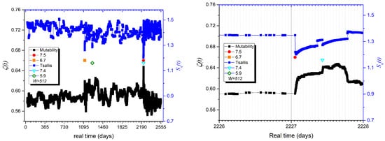 In a previous work based on the seismicity of Iquique in Northern Chile [21], it was reported that a premonitory behavior was detected for both Tsallis entropy and mutability days and even hours before the main 8.1 earthquake of 2014. To try to detect the possibility of prediction in the case of the Türkiye earthquakes, we prepared a similar treatment, which is presented in Figure 8. We include the Tsallis entropy (upper curve) and the mutability (lower curve) on the left-hand side. Both curves from the seven-year study are displayed in the left figure. The results show downward Tsallis needles coinciding with the upward mutability needles at the largest earthquakes. The right panel isolates just two days of the sequence, with the largest earthquake occurring in the early hours of the second day. As seen, both curves are flat on the previous day, meaning that the magnitudes of the earthquakes are very similar in the days prior to the earthquake. The only change happens at the moment of the large earthquake; no premonitory sign is found here. The previous “announcement” made by the 2014 earthquake in Iquique is likely because of a special behavior of the local dynamics, which does not necessarily accompany each earthquake.