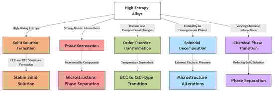 High-entropy alloys (HEAs) exhibit various phase transitions due to their multicomponent composition. These include solid-solution formation, phase segregation, and order-disorder transformations, which depend on atomic-scale interactions. Figure 2 provides a visual representation of these phase transitions, illustrating how mixing entropy, atomic interactions, and thermodynamic conditions drive structural changes in HEAs.