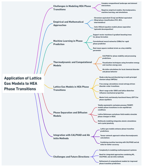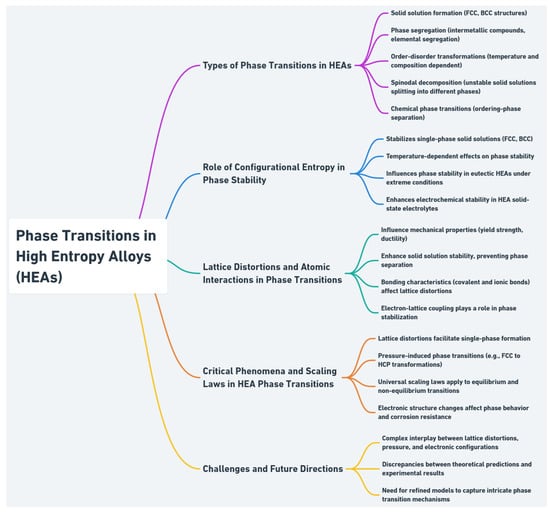 Despite recent advancements, fully capturing the interplay among lattice distortions, external fields (like pressure), and electronic effects remains a challenge. The development of universal scaling laws and critical phenomena provides a framework for further exploration, but discrepancies between theoretical predictions and experimental observations, such as those seen in AlCrFeMnMo HEAs, highlight the need for continued research and refinement of models [56]. Figure 3 presents a summary of the individual topics discussed in relation to the phase transitions in HEAs.
