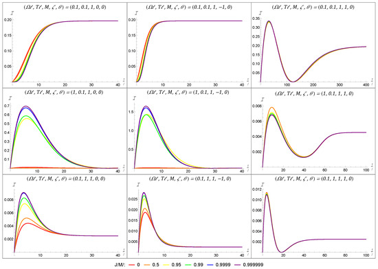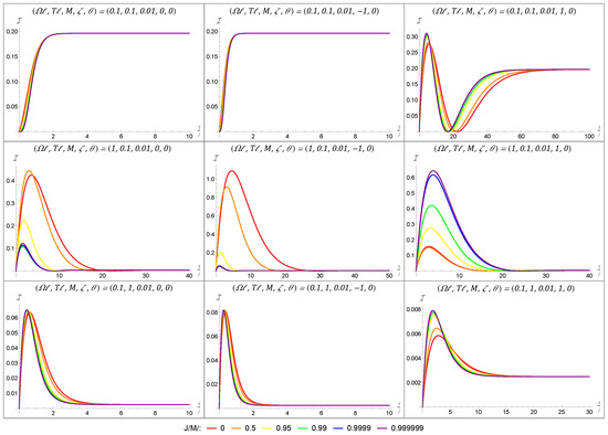 We note that, in order to produce the plots of the Fisher information, the image sum for Equation (33) was truncated to a finite number of terms. The number of terms included varied depending on the other parameters from our set-up, with smaller masses requiring a larger number of terms and large masses requiring fewer image sum terms to achieve numerical convergence. The effect of the black hole’s rotation on the Fisher information is first depicted in Figure 4 for a black hole with a large mass of . In each plot, we have considered a range of angular momenta varying from the static case ( in red) to an almost maximally rotating black hole ( in purple) using the colors of the rainbow. The grid layout of Figure 4 allows us to show how the the Fisher information varies when considering the energy-gap-to-temperature ratio (held constant in a given row) and the boundary condition (held constant in a given column). Throughout Figure 4, we have initialized the detector in the state parametrized by and have fixed the BTZ mass to be .