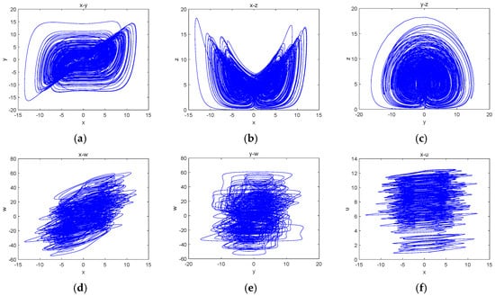 Projections of the attractors on different planes: (a) the x-y plane; (b) the x-z plane; (c) the y-z plane; (d) the x-w plane; (e) the z-w plane and (f) the x-u plane.