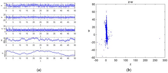 Keeping the parameters and initial values unchanged, the time series of , , , and are shown in Figure 2a, and the Poincaré map on the plane is presented in Figure 2b.