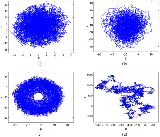 When and , . When , regardless of the values the other parameters of the system take, they do not affect the value of the dissipation degree, indicating that system (3) is dissipative, which suggests that the volume of the chaotic attractors in the phase space will be exponentially compressed to zero at an exponential rate. When , system (3) is conservative; eventually, its trajectory will no longer be confined to the attractors.