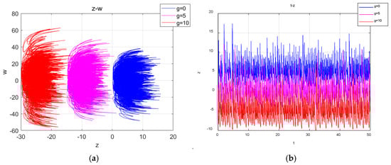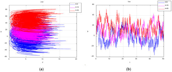 Projections of the attractors and time series in the z-w plane for different values of : (a) the projection of the attractors on the plane z-w; (b) the time series of .