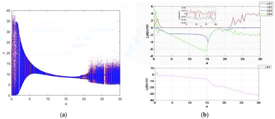 The symmetric coexistence properties of system (3) with parameter are investigated in this section through means of bifurcation diagrams and a Lyapunov exponential diagram. Let parameter be a variable control parameter with , , , , and , where the initial condition is (1, 1, 1, 1, 1)(blue) and (−1,(−1, 1,(−1,(−1)(red), the fixed step time is 0.01 s and the total duration is . The value of the Lyapunov exponent is calculated by the fourth-order Runge–Kutta method and the wolf algorithm, and the size of the value obtained by the different sampling points taken during the experiment is also different, which also depends on the performance of the computer. By obtaining as many sampling points as possible under the condition of ensuring that the computer can run and improving the accuracy of the value, the number of points taken from the Lyapunov exponent is 600, and the number of points taken from the bifurcation diagram is also 600; the obtained image is shown in Figure 6. The bifurcation diagram of the system state variables within the parameter [0,30] is shown in Figure 6a, and the Lyapunov exponential diagram is shown in Figure 6b. From the figure, it can be seen that the system goes through two different states, changing from periodic to chaotic: when [0,6], [7,10], [12.7,17.2] and [17.8,30], the system is in a chaotic state; when [6,7], [10,12.7] and [17.2,17.8], the system is in a periodic state.