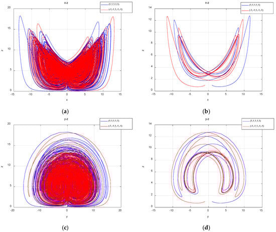 The projections of chaotic attractors and periodic attractors on different planes with initial value symmetry: (a) when , the projection of the attractors on the plane x-z is a chaotic system; (b) when , the projection of the attractors on the plane x-z is periodic; (c) when , the projection of the attractors on the plane y-z is a chaotic system; (d) when , the projection of the attractors on the plane x-z is periodic.