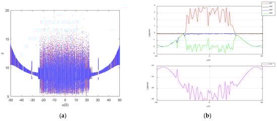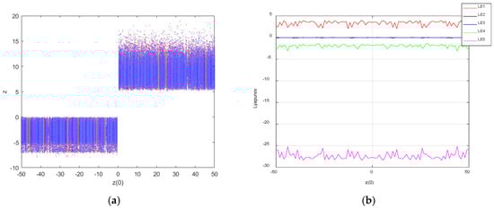 Let parameter be a variable control parameter; when , , , , , and , the initial condition was = (1,1,,1,1) and = (−1,−1,,−1,−1). The Lyapunov exponent spectrum was sampled at 500 points and the bifurcation diagram at 500 points, and the coexistence bifurcation diagram was drawn for the initial condition [−50,50]; the Lyapunov exponent spectrum is shown in Figure 11. Infinitely many chaotic states are exhibited on the bifurcation diagram in the range of [−50,50]. It is further conjectured that system (3) relying on the initial condition may also generate an infinite number of hidden coexisting attractors; it has hidden super-multistability.