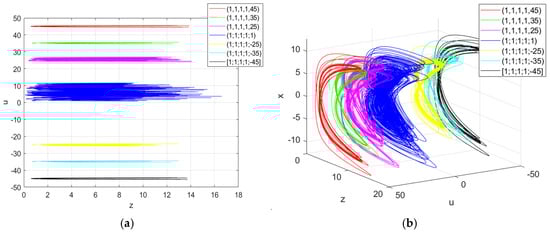Infinite homogeneous attractors: (a) the projection of the attractors on the plane z-u; (b) the projection of the attractors on the plane x-z-u.