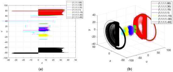 The parameters were set as above, and the initial values were set as (1,1,1,1,); when was taken as 60, 30, 15, 1,(−15,(−30 and –60 respectively, the system generated two-vortex and four-vortex chaotic attractors, as shown in Figure 10. This corresponds to the red, green, pink, blue, yellow, cyan and black chaotic attractors, respectively. It can be observed that these chaotic attractors showed a linear distribution along the -axis, which is consistent with the results of the previous analysis of the system bifurcation diagram. Through the above analysis, it can be found that the system can produce chaotic attractors with different structures, so the system has heterogeneous multistability, there are infinitely many coexisting attractors and the system behaves as a super-multistability system.