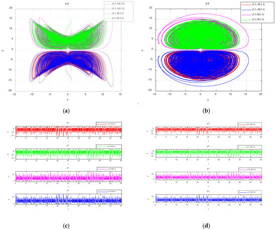Taking −15, −10, 10 and 15, the corresponding attractors are represented by four colors, red, blue, pink and green respectively; the obtained double-vortex chaotic coexisting attractors and time-domain waveforms in symmetric coordinates are shown in Figure 12.
