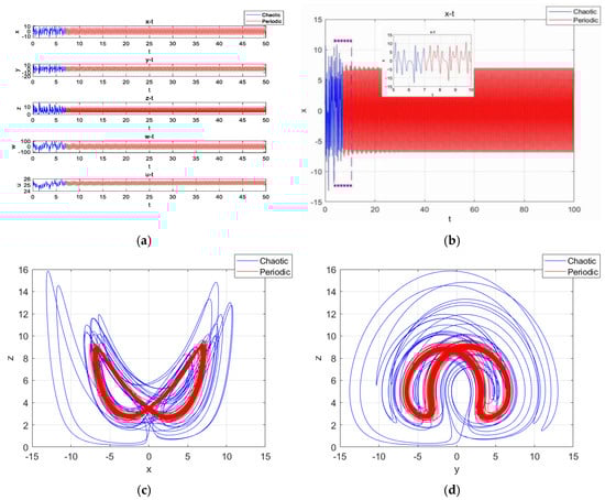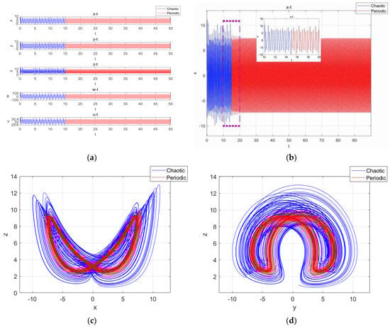 Fixing the parameters as , , , , , and , with the initial condition being (1,1,1,1,), the simulation time was set to [0,50], and the step size was 0.01. With , the time series of , , , and are shown in Figure 13a. Among them, the timing diagram of variable is shown in Figure 13b, with the simulation time being 0–100. When , the time-domain waveforms of the system were transformed from disorganized to regular and orderly, so the system underwent a state transfer at this time. The phase diagram of the motion trajectories in (0,15] and (15,50] is shown in Figure 13c, and the phase diagram of the motion trajectories in (0,15] and (15,50] is shown in Figure 13d.