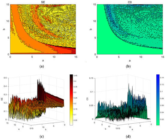 Spectrograms of complexity: (a) the SE complexity of ; (b) the C0 complexity of ; (c) spectrogram of three-dimensional SE complexity with and ; (d) spectrogram of three-dimensional C0 complexity with and .
