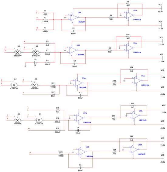 Chaotic circuits are essentially chaotic systems, and electronic circuits are usually utilized to generate chaotic signals and to demonstrate the physical existence of a chaotic system. Therefore, circuit implementation has become a necessary step for chaotic systems to move from theory to practical engineering applications. Here, a simple analog circuit is designed to verify the dynamical behavior of the new memristor super-chaotic system. The circuit includes circuit components such as linear capacitors, linear resistors, operational amplifiers and analog multipliers. Among them, the operational amplifier was chosen to be an LM2924N device with an operating voltage of ±15 V, and the analog multiplier was an AD633 device. A time scale transformation was performed, such that , where . The parameters were selected as follows: , , , , , and . System (3) can be represented as follows: