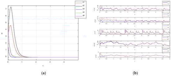 By setting the parameters of system (3) in the chaotic state with the parameters as , , , and the gain as and setting the initial value of the driving system as (1, 1, 1, 1, 1) and the response system as (5, 5, 2.5, 5, 5), the synchronization error curves of system (3) were obtained through simulation, as shown in Figure 19a. From Figure 19a, it is observed that the synchronization errors , , , and were synchronized at about , and they were asymptotically stabilized to zero in a short time. Meanwhile, the synchronized waveforms of all the variables when this hyperchaotic system reached synchronization are shown in Figure 19b, and it can be seen from Figure 19b that the waveforms , , , and of the driving system and the responding system converged to the same level within a short period of time, which demonstrates that the two systems achieved synchronization.