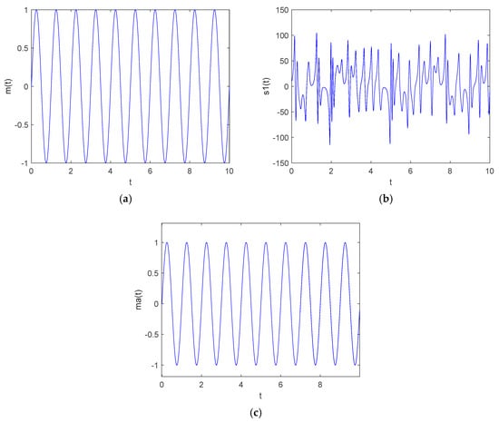 Firstly, the state variable was selected as the carrier signal, and the demodulation signal was . The original signal to be encrypted was ; then, the encrypted signal was , and the signal was sent to the receiver output signal through the channel in the ideal state . Then, the signal was used to subtract the demodulated chaotic signal generated by the synchronized response system implemented by the synchronization controller to obtain the decrypted information signal . The system parameters remained unchanged, the initial value of the drive system was set to (1, 1, 1, 1, 1), and the initial value of the response system was (5, 5, 2.5, 5, 5). According to the principle of chaotic masking secure communication encryption, the simulation results of the signal encryption and decryption were obtained by MATLAB numerical simulation, as shown in Figure 20.