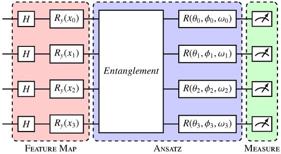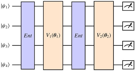A two-layered ansatz applied to four qubits. Each layer is defined by a variational circuit dependent on some parameters . The circuits are used to entangle the qubits, and the state denotes the output of the feature map.