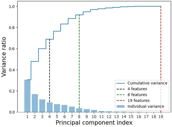 Cumulative variance of the data. The x-axis represents the component index, while the y-axis represents the variance. The sets used in this article were marked in black (4 features), green (8 features), and red (19 features, the complete dataset). The bars represent the individual variance of each component, while the blue line represents the cumulative variance.