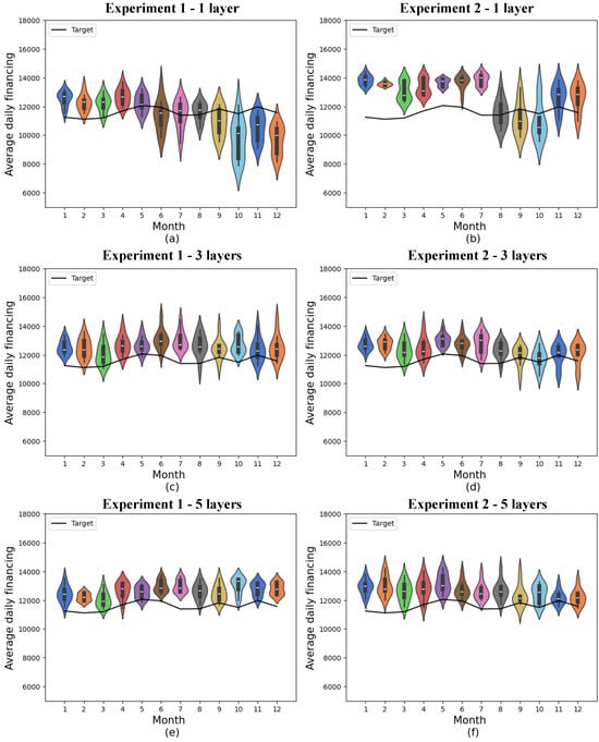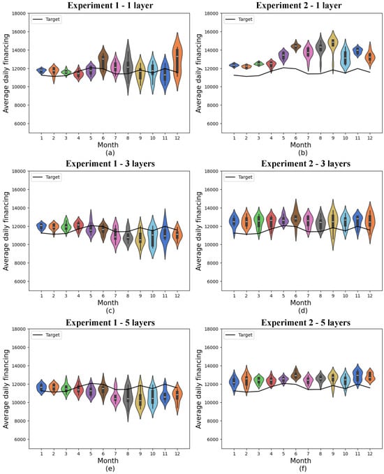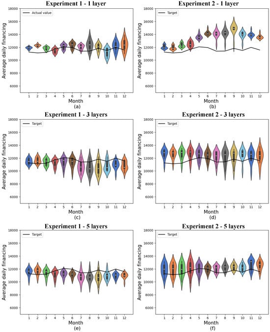 Predictions for quantum models with 8 features. (a) shows quantum experiment 1 with 1 layer, (b) quantum experiment 2 with 1 layer, (c) quantum experiment 1 with 3 layers, (d) quantum experiment 2 with 3 layers, (e) quantum experiment 1 with 5 layers, and (f) quantum experiment 2 with 5 layers. The x-axis shows the model’s training months, while the y-axis represents average daily financing. The distributions obtained from 10 experiments are shown in the colored violin graphs, while the actual values are shown in the black line.