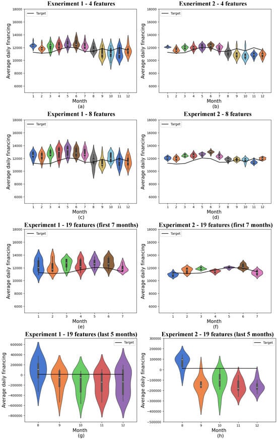 Predictions for classical models. (a) shows classical experiment 1 with 4 features, (b) classical experiment 2 with 4 features, (c) classical experiment 1 with 8 features, (d) classical experiment 2 with 8 features, (e) the first 7 months of classical experiment 1 with 19 features, (f) the first 7 months of classical experiment 2 with 19 features, (g) the last 5 months of classical experiment 1 with 19 features, and (h) the last 5 months of classical experiment 2 with 19 features. The x-axis shows the model’s training months, while the y-axis represents average daily financing. The distributions obtained from 10 experiments are shown in the colored violin graphs, while the actual values are shown in the black line.