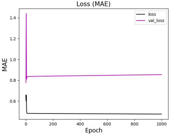 Convergence of the quantum model with the set of 4 features and 1 layer with 1000 epochs. The x-axis shows the training epochs, while the y-axis shows the mean absolute error (standardized values). The black curve shows the test loss, while the magenta curve shows the validation loss.