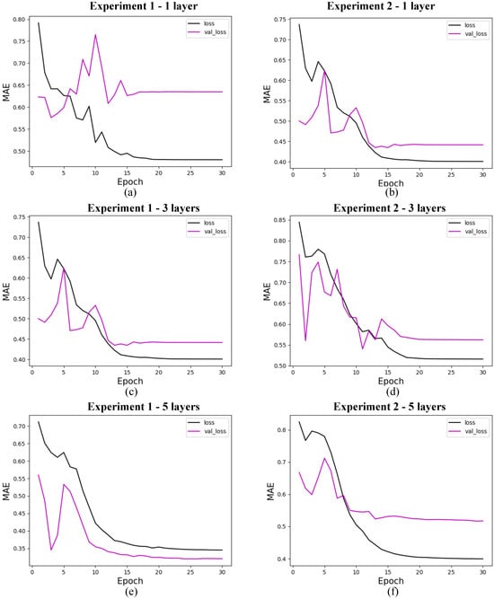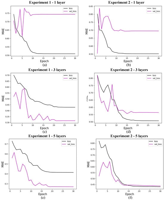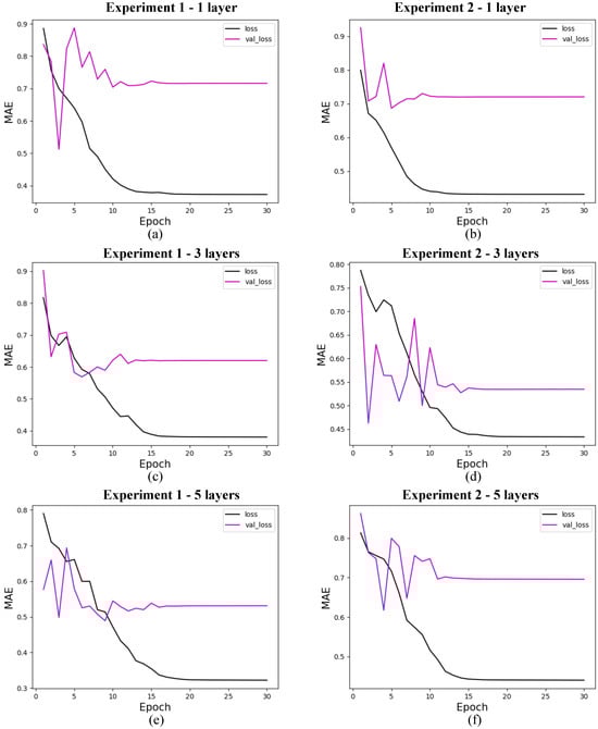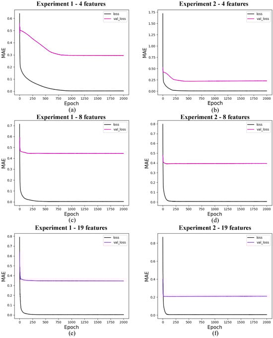 Loss for classical models. (a) shows the loss for classical experiment 1 with 4 features, (b) for classical experiment 2 with 4 features, (c) for classical experiment 1 with 8 features, (d) for classical experiment 2 with 8 features, (e) for quantum experiment 1 with 19 features, and (f) for classical experiment 2 with 19 features. The x-axis shows the training epochs, while the y-axis shows the mean absolute error (standardized values). The black curve shows the test loss, while the magenta curve shows the validation loss.