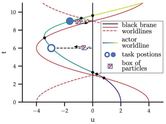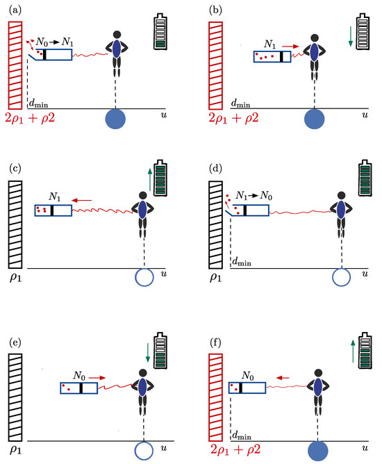 The initial position—The actor begins at the closed blue dot in Figure 1 and Figure 2, positioned at d●. At this particular instance of time, the outer branes coincide with the central brane at , effectively forming a single brane with high mass-density. The observer carries an energy storage device (a battery), which is partially charged (e.g., it is shown to be full in the cartoon in Figure 2). The observer also holds a closed (massless) box at a distance from the central brane’s horizon, containing particles with total energy .