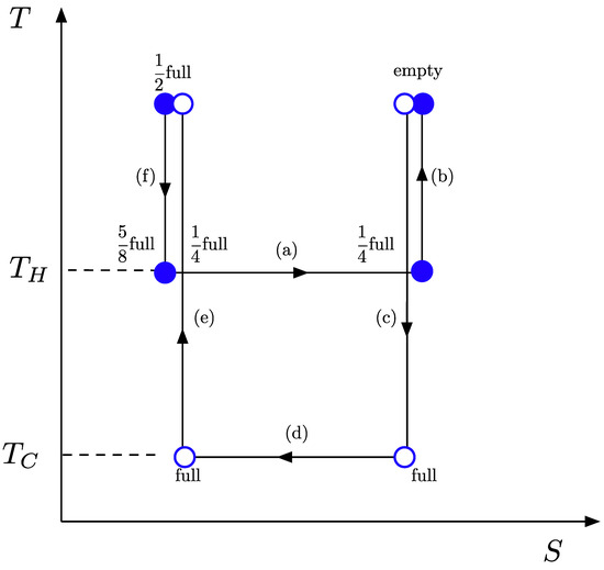 Process (d): Heat Release—Next, particles are allowed to flow out of the box until the initial number of particles, , is restored. This reduces the entropy contained in the box, and releases heat . The system’s energy changes by .