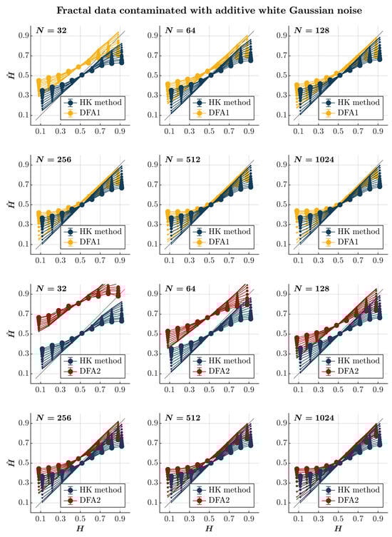 Both the HK method and the first-order DFA overestimate for anti-persistent time series (i.e., ) contaminated with awGn and underestimate H for persistent time series contaminated with awGn (; blue and yellow circles, respectively, in Figure 1). These effects are accentuated with the magnitude of the added awGn. Adding awGn to an anti-persistent time series will render it less anti-persistent, and adding awGn to a persistent time series will render it less persistent, which is quite intuitive. Nonetheless, the HK method yields more accurate values for anti-persistent time series contaminated with awGn. In contrast, the first-order DFA yields more accurate values for persistent time series highly contaminated with awGn. This contrast highlights the typical tendency of the first-order DFA to overestimate long-range temporal correlations [,], which does not seem to be the case with the HK method, as noted previously []. Notably, these effects do not seem to depend on the time series length, reflecting the length-independent effect of added awGn on long-range temporal correlations in synthetic time series. The second-order DFA consistently overestimates in short time series, regardless of their persistence characteristics. However, it produces a more accurate estimation of for persistent time series, particularly when they are both sufficiently long and heavily contaminated with awGn (red circles in Figure 1).
