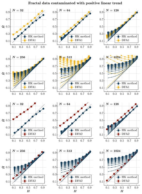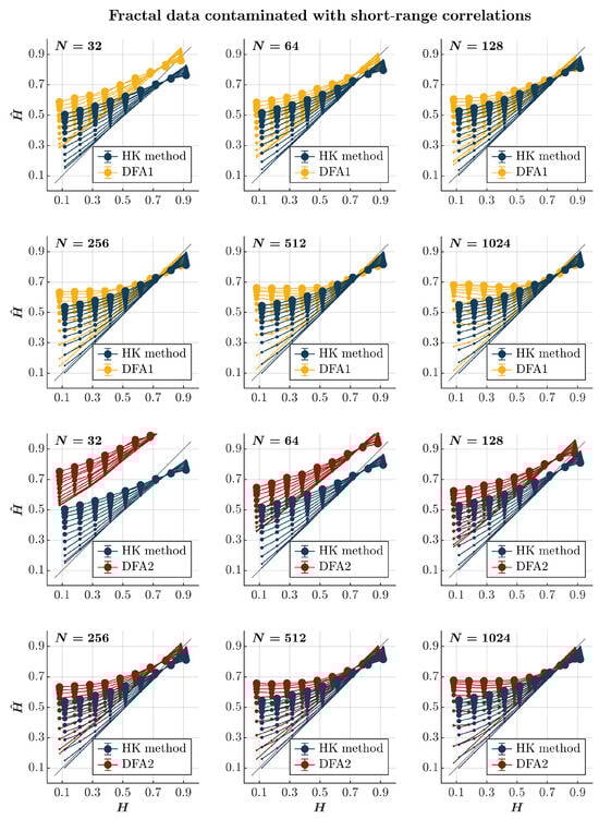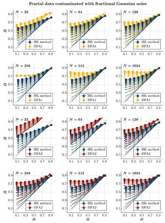 Both the HK method and the first-order DFA overestimate for both anti-persistent and persistent time series contaminated with fGn, independently of the time series length (blue and yellow circles, respectively, in Figure 2), confirming the theoretical expectation that adding fGn—which is long-range correlated—will increase the strength of the long-range temporal correlations in the original time series. Likewise, the extent of overestimation is accentuated with the magnitude of the added fGn. The overestimation of H is particularly problematic for anti-persistent time series, for which both methods yield values indicating persistence. Although of no practical use in this situation, the HK method is marginally better than the first-order DFA in providing substantially larger but comparatively less biased estimates of , highlighting the typical tendency of the first-order DFA to overestimate long-range temporal correlations [,]. Furthermore, the HK method yields a marginally overestimated yet more accurate than the first-order DFA for highly persistent time series (). The second-order DFA significantly amplifies the overestimation of in extremely brief time series (), irrespective of their persistence characteristics. Nevertheless, it results in a milder overestimation of for anti-persistent time series with and an underestimation of for persistent time series, especially in cases where they are heavily contaminated with fGn (red circles in Figure 2).