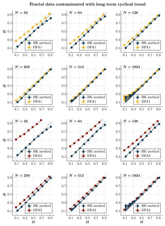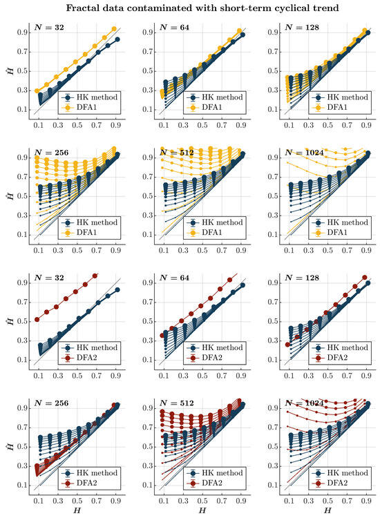 Consistent with previous observations [], contaminating time series with a short-term cyclical trend—the term comparable to the timescale of the entire time series—leads to an overall overestimation of , independently of persistence or the lack thereof, using both the HK method and the first-order DFA (blue and yellow circles, respectively, in Figure 4). Notably, while this overestimation grows with the magnitude of the cyclical trend and the time series length for both methods, it renders the first-order DFA useless, yielding values exceeding 1 for anti-persistent time series () of length —which is longer than the recommended length for DFA []. Although the HK method also deems anti-persistent time series persistent in the presence of a short-term cyclical trend, it estimates for more persistent time series () with acceptable accuracy. The second-order DFA markedly exacerbates the overestimation of in time series with ; intriguingly, the estimated by the second-order DFA remains unaffected by the contamination amplitude. In contrast, for time series with , the second-order DFA yielded a less inflated compared to the first-order DFA, yet it still performed inferiorly to the HK method (red circles in Figure 4).