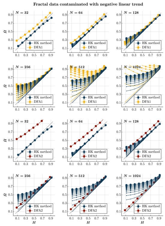 Consistent with previous observations [], contaminating time series with a positive or negative linear trend consistently results in the overall overestimation of using both the HK method and the first-order DFA, regardless of the presence or absence of persistence (blue and yellow circles, respectively, in Figure 6 and Figure 7). Although the HK method accurately estimates for time series with , the overestimation amplifies with the linear trend’s magnitude and the time series length for both methods. For the first-order DFA, this overestimation renders it impractical, yielding values reaching for anti-persistent time series with and surpassing 1 for anti-persistent time series with , exceeding the recommended length for DFA []. Despite the HK method misclassifying anti-persistent time series as persistent, especially for those with , it demonstrates acceptable accuracy in estimating for more persistent time series (). However, even the HK method exhibits a progressively more overestimated for these time series with an increasing time series length. On the other hand, the second-order DFA consistently results in an overall overestimation of for time series with . However, it outperforms the HK method in accurately estimating for time series with , regardless of whether the time series is contaminated with a positive or negative trend (red circles in Figure 6 and Figure 7).