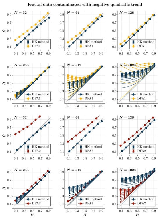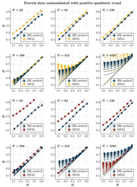 Consistent with previous observations [], contaminating time series with a positive or negative quadratic trend yields effects akin to those induced by a linear trend, albeit with a more gradual escalation dependent on the time series length. Specifically, introducing a positive or negative quadratic trend results in the pervasive overestimation of when using both the HK method and the first-order DFA, regardless of persistence (blue and yellow circles, respectively, in Figure 8 and Figure 9). While this overestimation escalates with the magnitude of the quadratic trend and the time series length for both methods, the estimate remains reliable for a time series of length . Simultaneously, the HK method and the first-order DFA misclassify anti-persistent time series () with a length of as persistent in a positive or negative quadratic trend. However, the HK method accurately estimates for more persistent time series (), indicating superior overall performance when long-range correlated time series are contaminated with a positive or negative quadratic trend. On the contrary, the second-order DFA consistently results in an overall overestimation of for time series with . Nevertheless, it surpasses the HK method in accurately estimating for time series with , regardless of whether the contamination involves a positive or negative quadratic trend (red circles in Figure 8 and Figure 9).