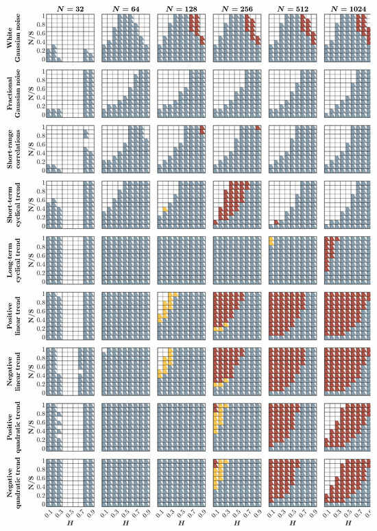 Comparison of the Bayesian HK method, first-order DFA, and second-order DFA in estimating the fractal Hurst exponent, , in the presence of awGn, fGn, short-range-correlations, and linear and quadratic positive and negative trends. Each panel indicates the method that estimates most accurately based on the estimated for 1000 synthetic time series of length with a priori known values of H, to which additive noise, short-range-correlations, or trends were added with different weights ranging from 0 to 1 with an increment of (noise to signal ratio, ). Blue, yellow, and red squares indicate that the Bayesian HK method, DFA1, or DFA2, respectively, provides the most accurate estimation of . Only those cases for which the difference between the actual and estimated values, i.e., , are shown; white boxes indicate , suggesting that none of these methods should be used to estimate in these cases.