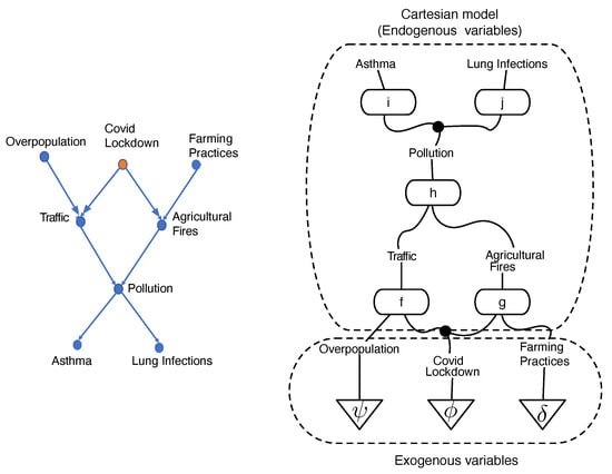 A Cartesian cPROP causal model that represents a structural causal model of pollution in New Delhi, India (based on original model defined in [14]). Here, following the usual custom in SCMs [2], the functions defining endogenous variables (, and j) are deterministic, whereas the exogenous variables are defined by probability distributions (e.g., defines a distribution in a Markov category). In keeping with the usual practice [9,17], information flows from bottom to top in string diagrams, which is the opposite of DAG models. Also, nodes in DAG models represent variables, and the functions are implicitly defined by the edges. In string diagrams, the edges define variables, and the functions are explicitly represented as boxes. To fully specify a cPROP causal model, we have to define a functor that maps such a string diagram into a decomposable stochastic process, which is illustrated later in Figure 12.